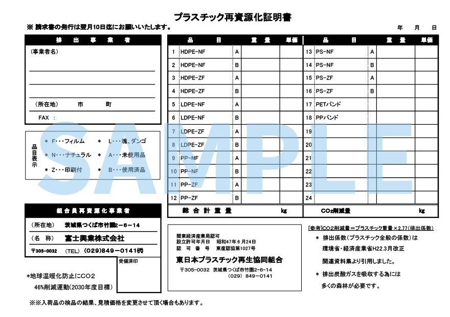 当社では「東日本プラスチック再生協同組合」が発行する正規の証明書を提供しています。これはプラスチックが適切に回収・分別・再資源化されていることを、第三者機関が公式に証明する書類です。