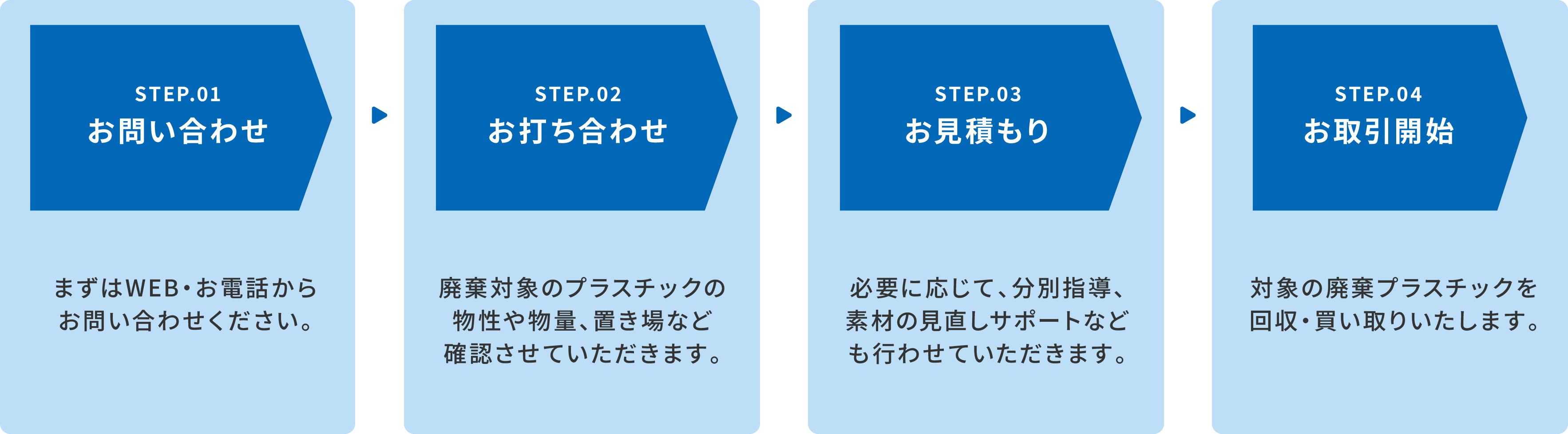 また、単なる回収にとどまらず、素材の見直しや価格設定まで丁寧にサポートし、お客様ごとに最適なプランをご提案します。処理にお困りの廃棄プラスチックを、「価値ある資産」に変えるお手伝いをいたしますので、ぜひお気軽にご相談ください。