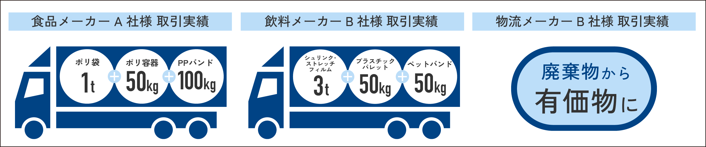 買い取り対象の廃棄プラスチックは、ストレッチフィルムやPPバンドなどの一般的な資材はもちろん、他社で断られてしまった素材でも、長年のノウハウを活かして対応できるケースも。なかには他社の20倍規模の取引を実現した事例もございます。